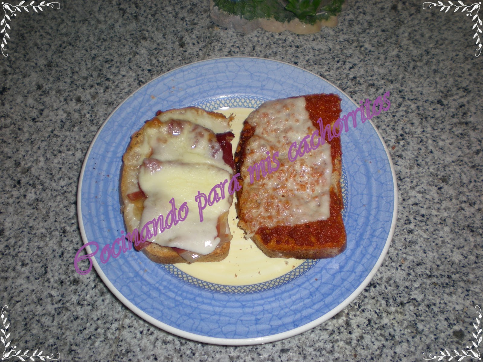 Se cortan un par de rebanadas de cualquiera de los panes que hago con la panificadora, se ponen los ingredientes elegidos sobre ellas y se colocan en la bandeja del hornillo, con las dos resistencias encendidas, unos 15 minutos, dependiendo del grado de tueste que a cada uno nos guste y se sirve acompañado de una ensalada.