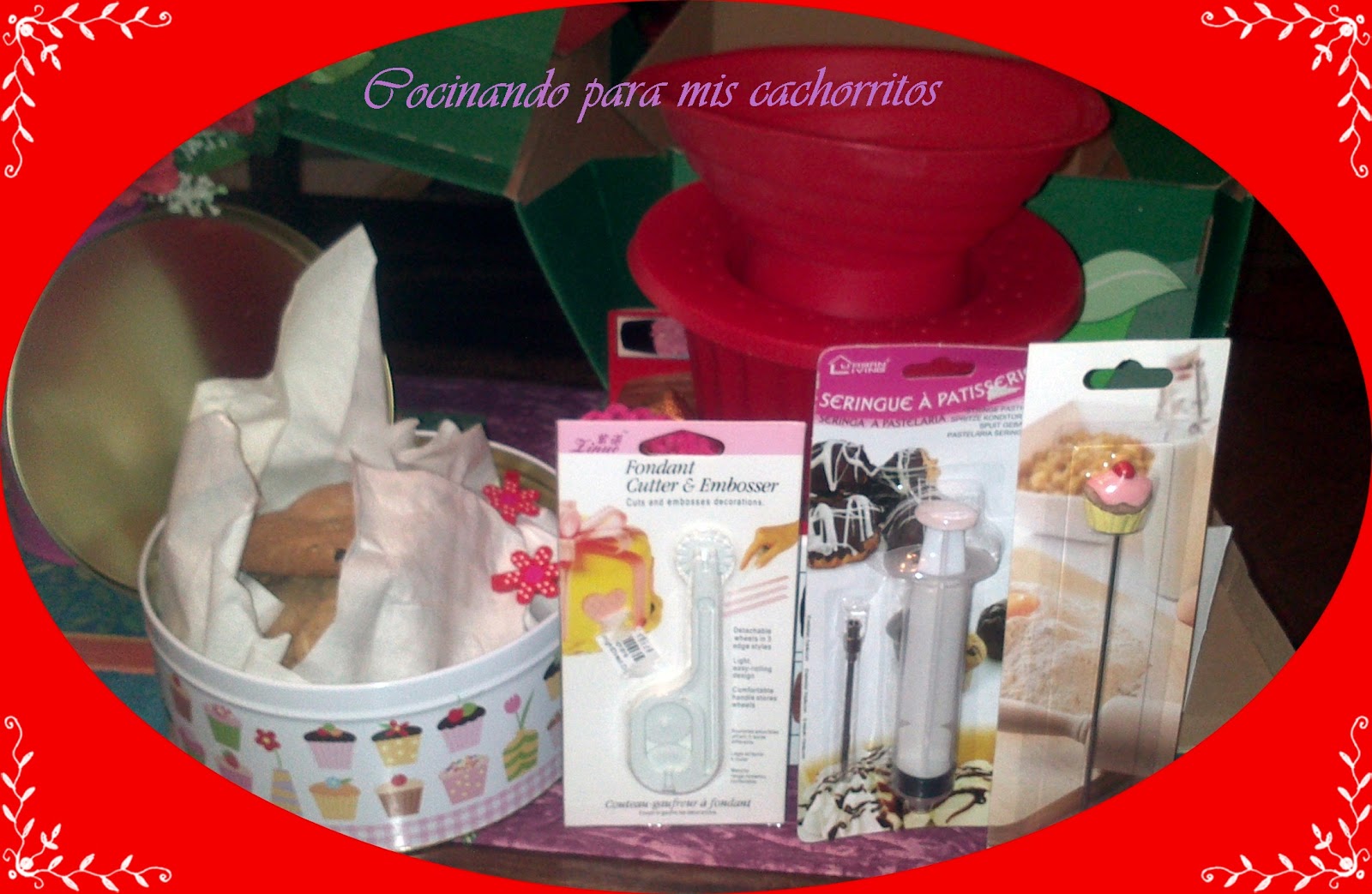 Un molde mágico para pasteles que todavía tendré que estudiar un poco, pero que pienso usar en breve, varios accesorios de repostería, una postal de navidad felicitándonos el año a mi familia y a mí, una pulsera y una lata de galletas llena de deliciosas galletas con pepitas de chocolate blanco y chocolate negro. No tardé ni un momento en probarlas y de verdad que están buenísimas (a ver si me hago con la receta, muy muy ricas).