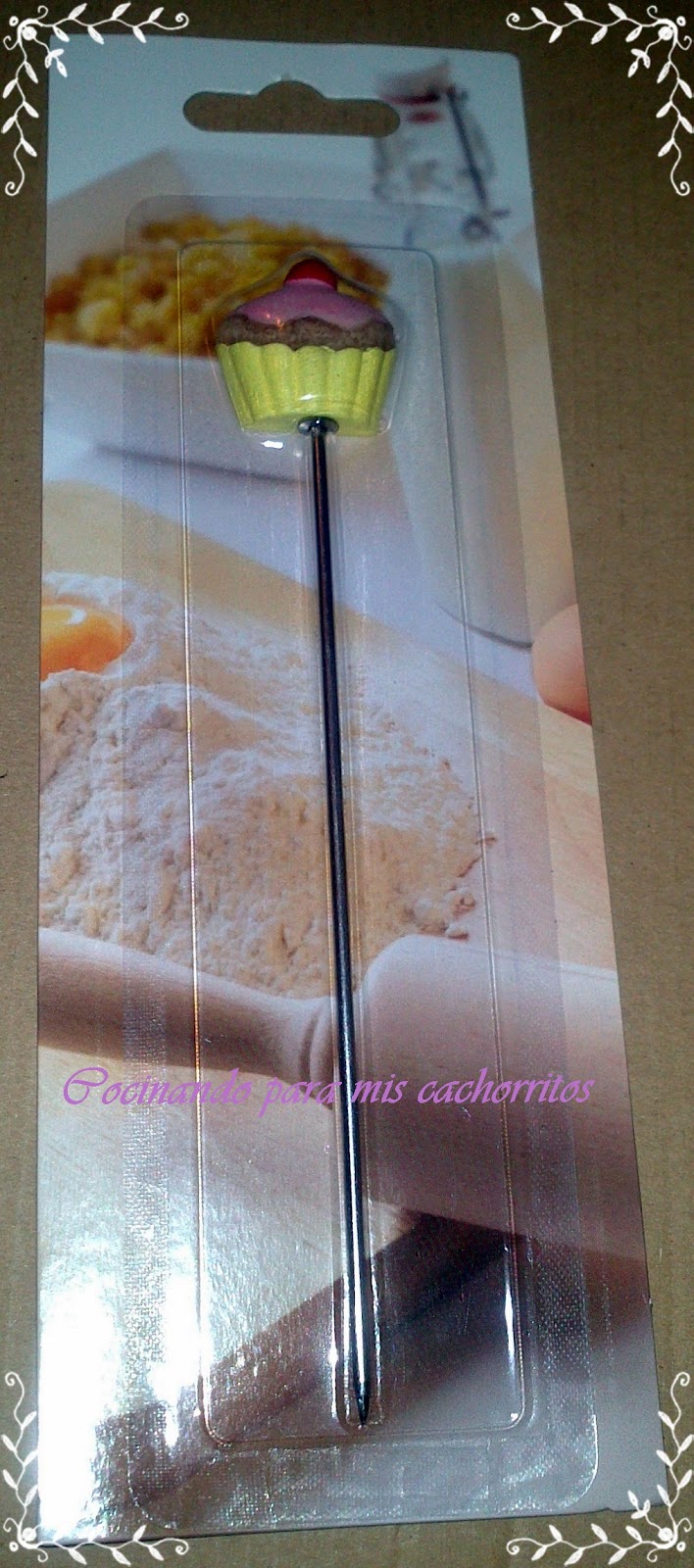 Esto es un pincho para comprobar que los bizcochos no están crudos. Me parece una idea genial porque siempre decimos “pinchar con un palito para comprobar que está hecho” y yo siempre uso un pincho de brocheta que luego hay que tirar porque se queda manchado de bizcocho. Pues ahora puedo comprobarlo con este invento. Genial. |