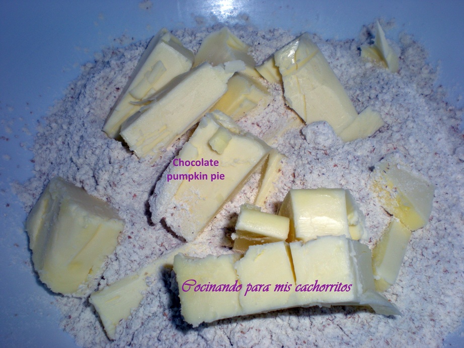Mezclamos la harina con la mantequilla fría cortada en daditos pequeños, hasta que se nos quede una mezcla arenosa. No tiene consistencia de masa.