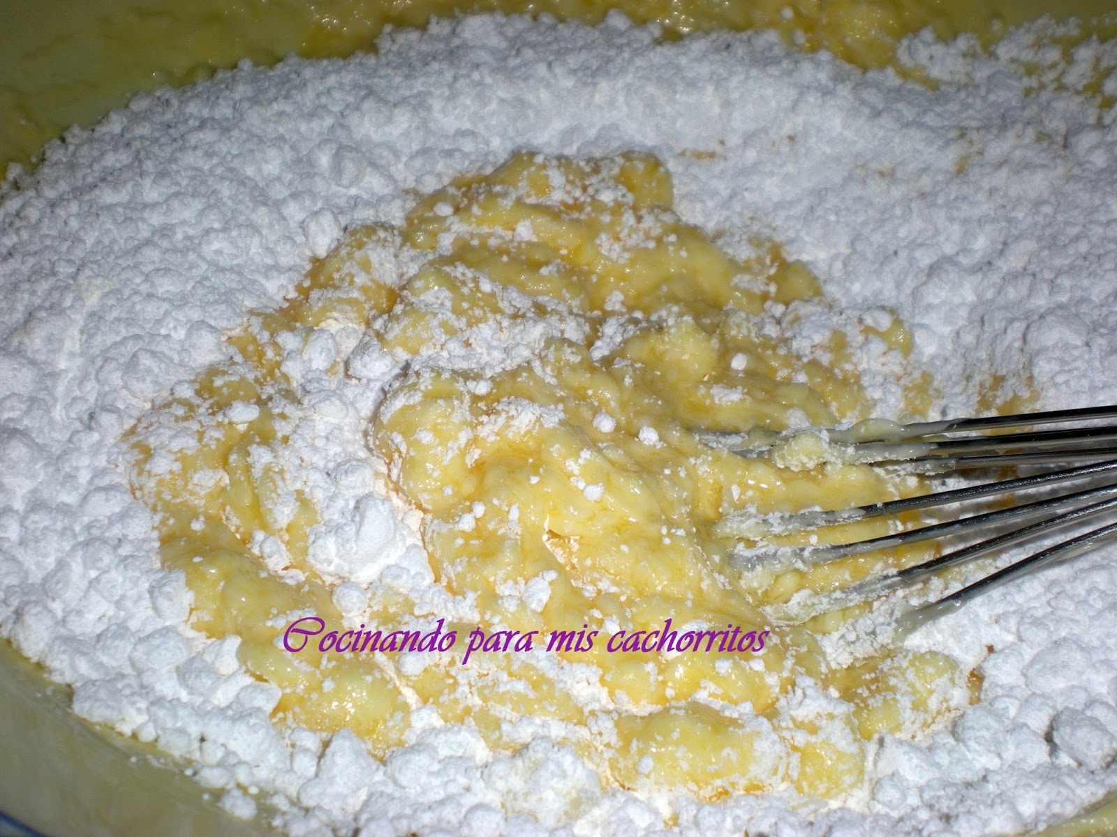 - Vamos incorporando poco a poco la harina tamizada y a la mezcla anterior y mezclando bien con las varillas. Es mejor hacerlo de a poquitos porque nos resultará más fácil trabajar la masa y que no queden grumos.
