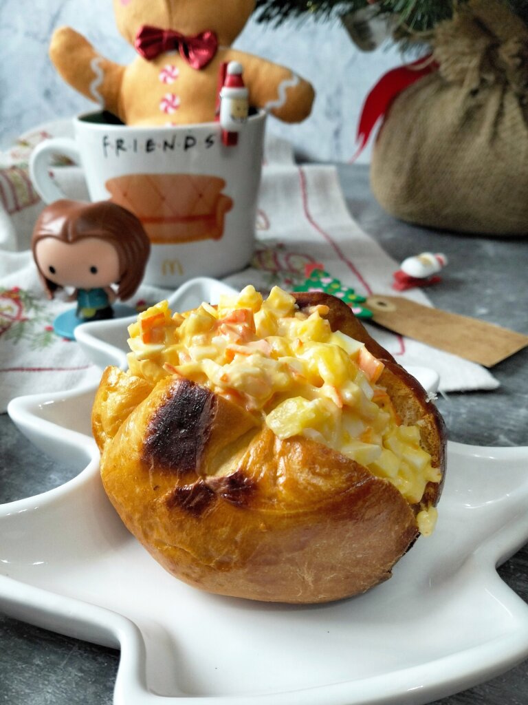 Sin embargo, yo he hecho una versión más económica (he usado surimi en su lugar) y fácil con panecillos caseros. Puedes usar cualquier pan dulce tipo brioche cuya textura acompaña a la perfección al relleno que os he preparado. Por ejemplo, los panes de patata son mi opción favorita últimamente cuando de rellenar se trata, aunque tenéis también los panes de leche más clásicos o, incluso, unos panecillos de avena facilísimos y deliciosos.