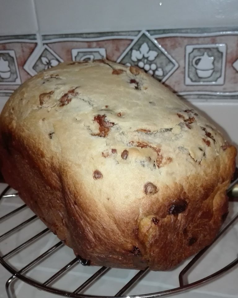 brioche de mantequilla en panificadora. Ella le ha añadido pepitas de chocolate. Mirad qué pinta.